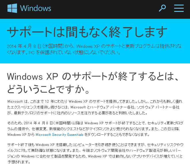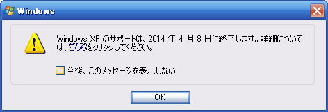 3月22日(土)Windows XP サポート収量のお知らせウインドウ