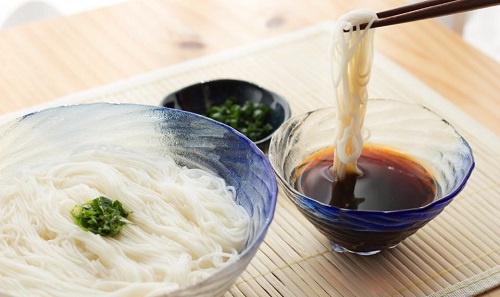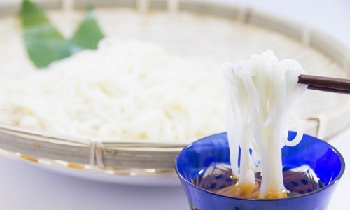 そうめん:小麦粉を塩水でこねて生地を作り、油を塗りながら手を使って細く延ばす麺