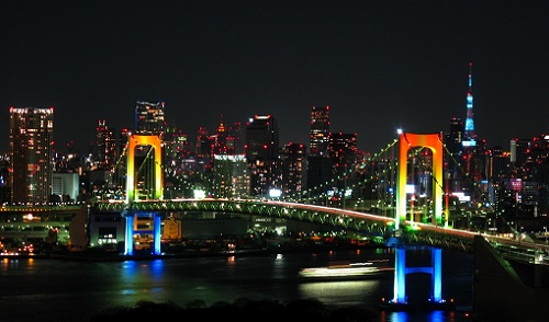 東京都の臨海部に架かるレインボーブリッジは、7色にライトアップされた。