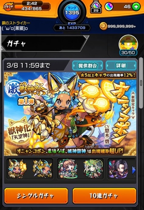 ●モンスト●激・獣新祭 新限定 オニャンコポン ×[PR]上記の広告は3ヶ月以上新規記事投稿のないブログに表示されています。新しい記事を書く事で広告が消えます。 ランキング参加中! ただいまコメントを受けつけておりません。 ●モンスト●激・獣新祭 新限定 オニャンコポン 「激・獣神祭」に新限定キャラクターとして「オニャンコポン」が登場!。 オニャンコポンは「天空神」と「救世神」の2通りの獣神化があるみたい。 書庫もやり終わってるし、あとは神獣の聖域の未クリアオーブを残すのみ。 いこうと思えば、10連いけなくもない・・・ 単発で我慢。 フレンドの鍛えられた オニャンコポン を使い、マーチに挑んだ! サクッとクリアーできた。 こりゃ強いなぁ! でも、もうマーチは作り終わってるし、アリスがいるんで我慢。 次のコラボやらのために温存。 PR ランキング参加中!