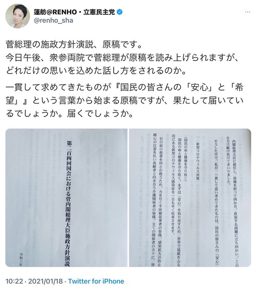 18日、蓮舫代表代行は、菅首相が同日行った施政方針演説の原稿の一部を、首相の演説前にツイッターに投稿。