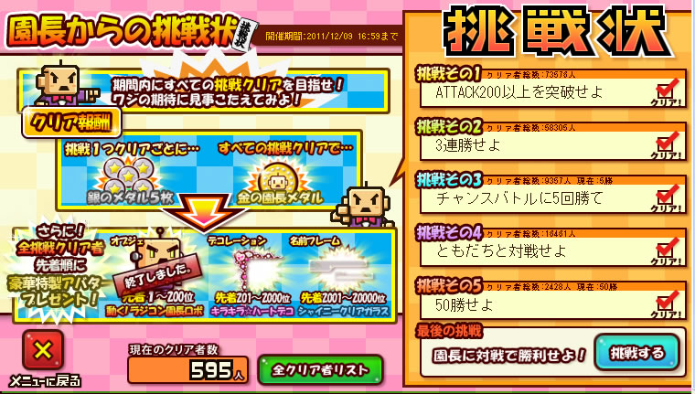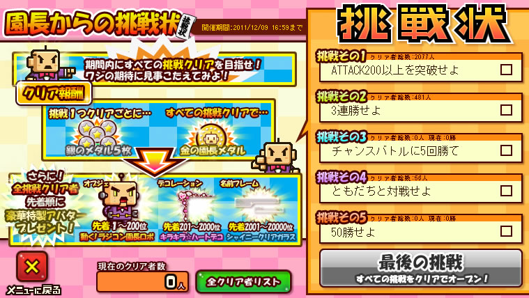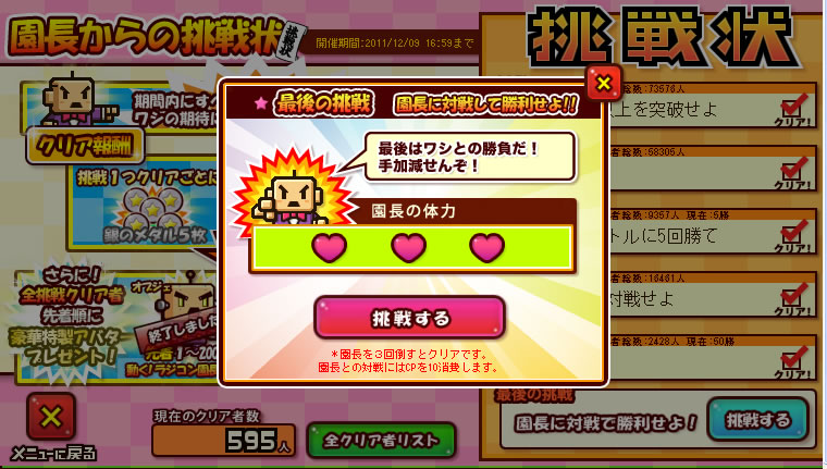 「挑戦その1」から「挑戦その5」まで5つの挑戦を全てクリアすると「最後の挑戦」が出現します。「最後の挑戦」ではなんと、園長自らが・・・!?