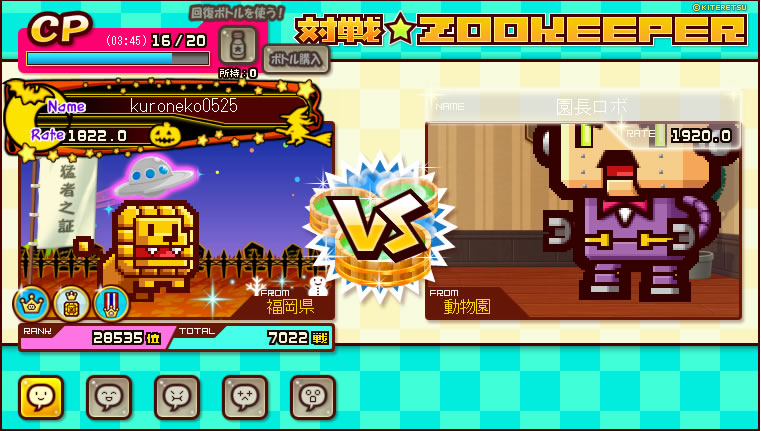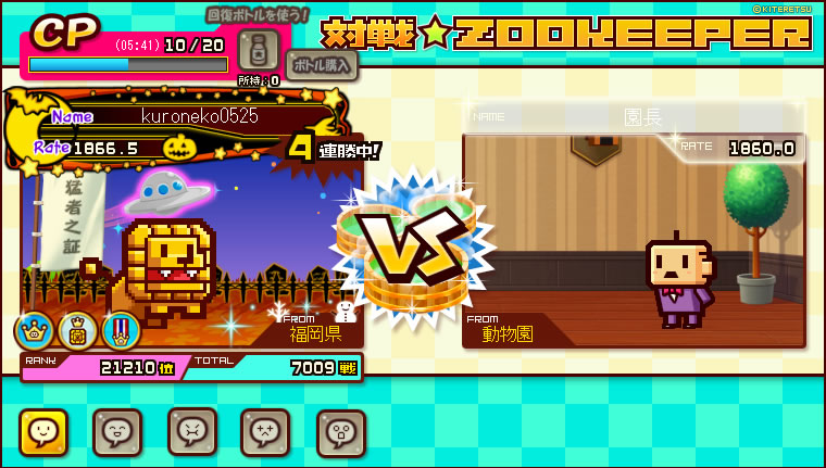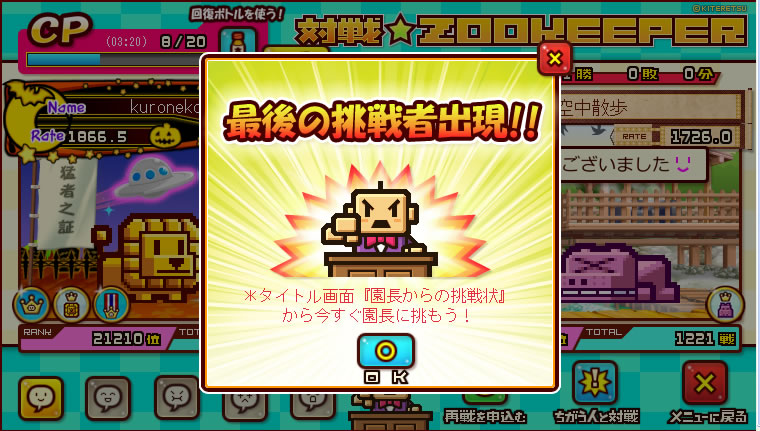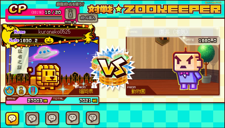 挑戦するをクリックすると、自分と同レートの園長が登場し対戦
