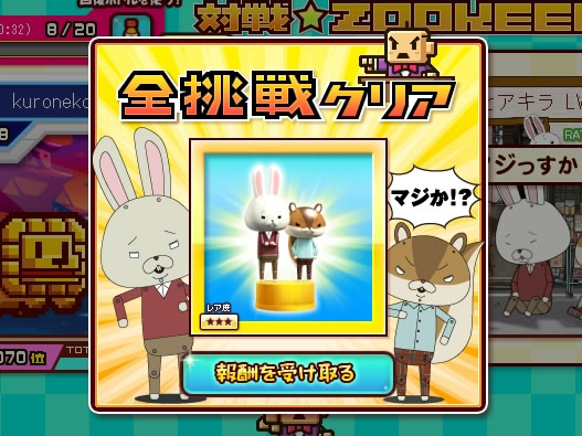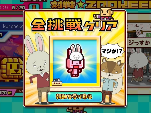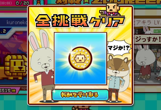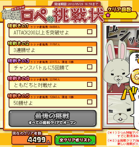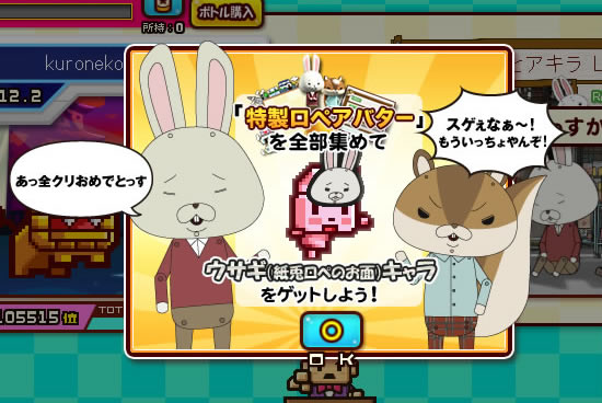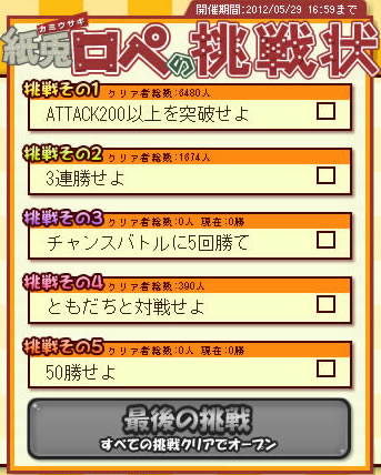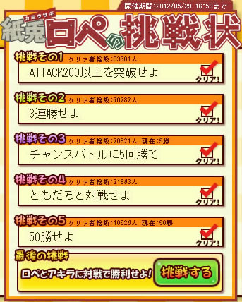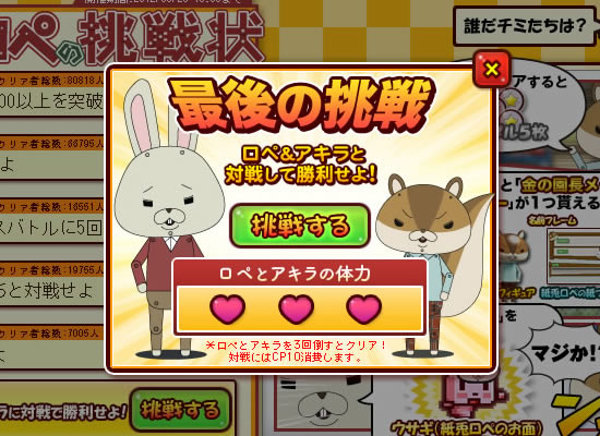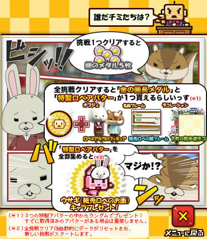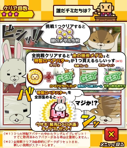 【ルール】:「挑戦その1」から「挑戦その5」まで5つの挑戦を全てクリアすると「最後の挑戦」が出現します。「最後の挑戦」をクリアするとロペとアキラ先輩からの素敵なプレゼントがもらえるぞ!2周、3周とクリアして全ての「特製ロペアバター」を集め、特製キャラクターのゲットを目指そう!