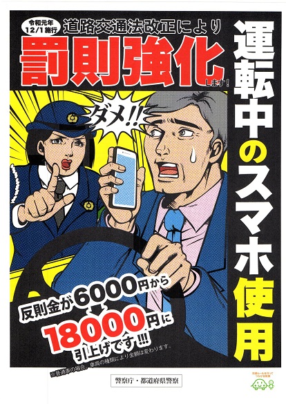 主な改正点は、走行中の携帯電話等の使用する「ながら運転」の罰則強化。