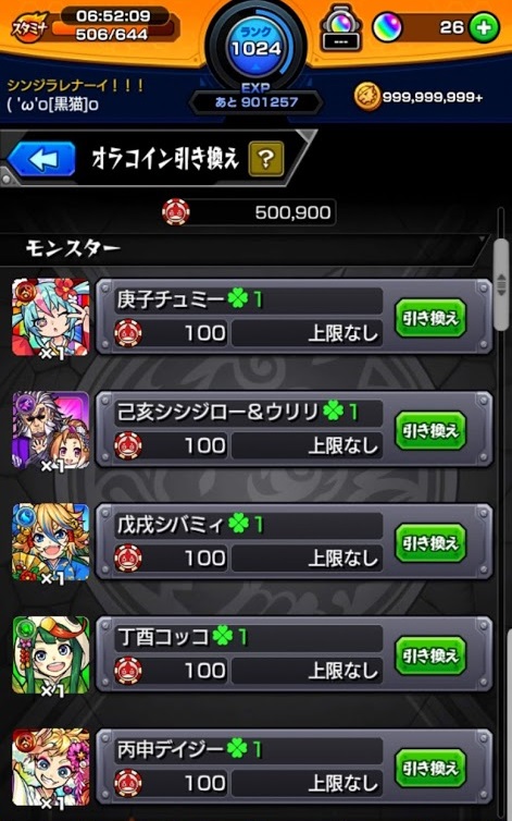 ●モンスト●オラコイン第3弾 引き換え 第3弾(期間:1/1(水)0:00~1/14(火)11:59)のオラコイン。 獣神化ローレライを使いまくった!! 50万貯まったんで引き換える事にした。 全引き換えと引き換えモンスターが5体ずつ運極になるくらいの枚数。 引き換え後の合成がちと面倒だったけど・・・・・・ 今年は、運極何体作れるかなぁ~。 中には3日の時点で100万コインに到達している人や、 このイベントで運極100体を作るといった目標を立ててる人もいた。 上には上がいるもんですネ (*´▽`*) PR ランキング参加中!