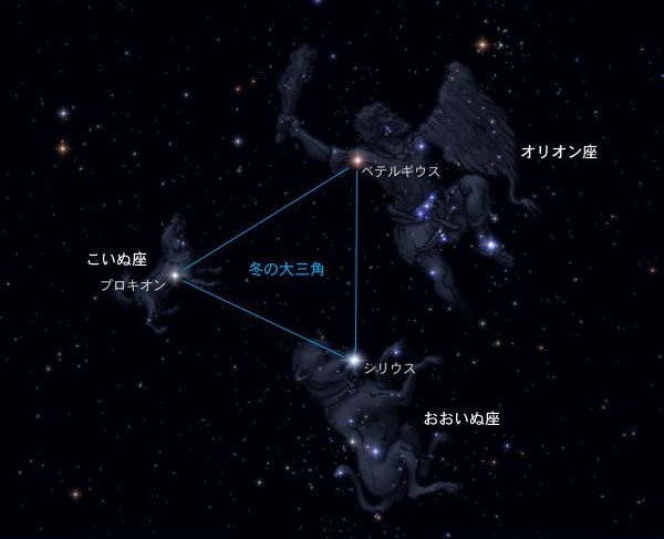 おおいぬ座のシリウス と こいぬ座のプロキオン 、ベテルギウス を結ぶ三角形は、「冬の大三角形」と呼ばれている。
