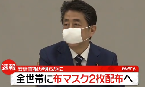 安倍首相が、4月1日夜の会合にて「全世帯(1世帯につき)に 布マスク2枚 配布」を表明。