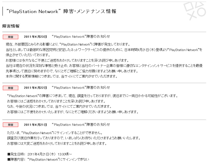 4月23日(土)PSN(PlayStation NetWork) アクセス障害
