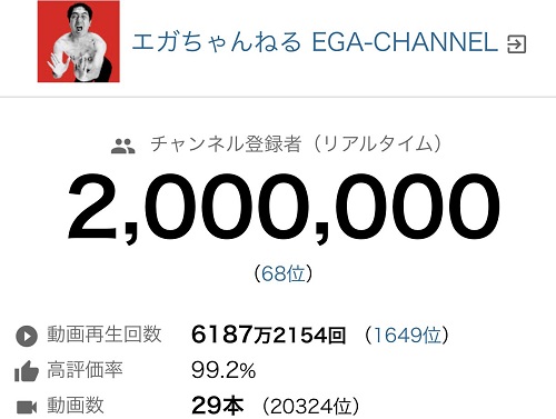 1月31日に開設された 江頭2:50 の YouTubeチャンネル「エガちゃんねる」の登録者数が、4月15日の午前2時前に登録者数が200万人を超えた。