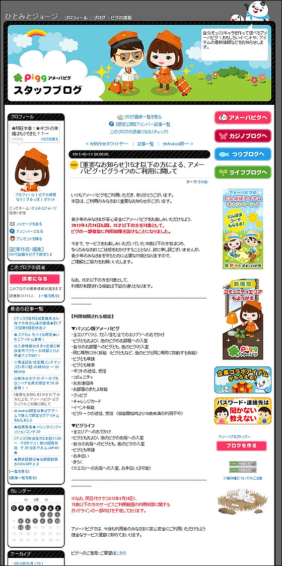 「青少年のみなさまが安心安全にアメーバピグをお楽しみいただけるよう、2012年4月24日以降、15才以下の方を対象として、ピグの一部機能に利用制限を設けることになりました。」