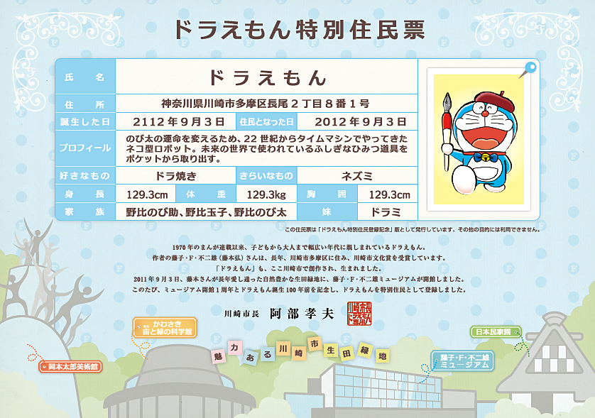 9月3日(月)ドラえもん 生誕100年前 ×[PR]上記の広告は3ヶ月以上新規記事投稿のないブログに表示されています。新しい記事を書く事で広告が消えます。 ランキング参加中! ただいまコメントを受けつけておりません。 9月3日(月)ドラえもん 生誕100年前 今日2012年9月3日は、ドラえもんの“生誕100年前”にあたる。これを記念して、神奈川県川崎市ではドラえもんの「特別住民票」を配布。 (クリックで拡大画像) 同市HPでもダウンロードできるとのこだったので、記念にもらっておいた あと100年でドラえもんが出来ているのだろうか・・・ PR ランキング参加中!