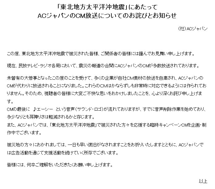 震災後、各企業が自社CMを自粛。そのため、空いてしまった広告枠にACジャパンのCMが入り、大量放送中。確かに、かなりの頻度で見かけるようになったね。